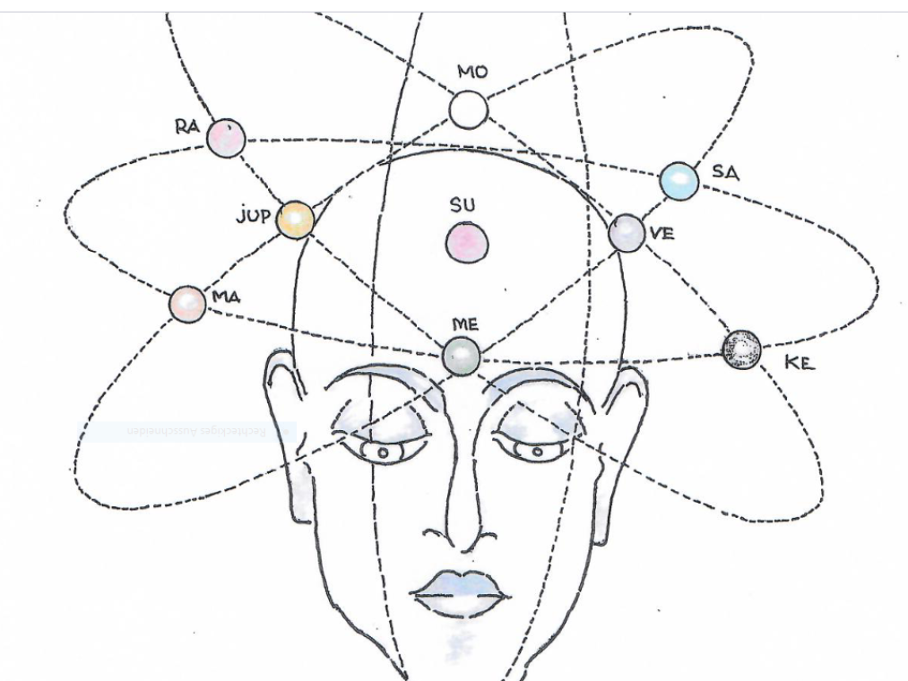 Unsere Seelenanteile können wir unseren Chakren oder wie hier dargestellt unseren Kopfregionen zuordnen. Nach dem vedischen System sind dies Atma, unser Seelenhelfer, unsere Mutter und unser Vater, unser Kind, Hindernisse die es zu überwinden gilt unser Partner und unser innerer Engel.